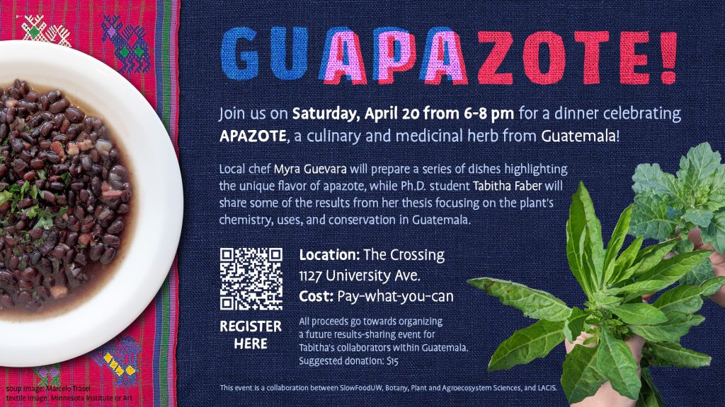 Curious to learn about the morphological and chemical differences in apazote/epazote (Dysphania ambrosioides) in Guatemala and taste this herb in delicious in several dishes prepared by a Guatemalan chef? Go to The Crossing on April 20, from 6:00-8:00 PM for a dinner celebrating an amazing herb called ‘apazote’. Local chef Myra Guevara will prepare a series of dishes highlighting the unique flavor of apazote, while Ph.D. student Tabitha Faber will share some of the results from her thesis focusing on the plant’s chemistry, uses, and conservation in Guatemala.